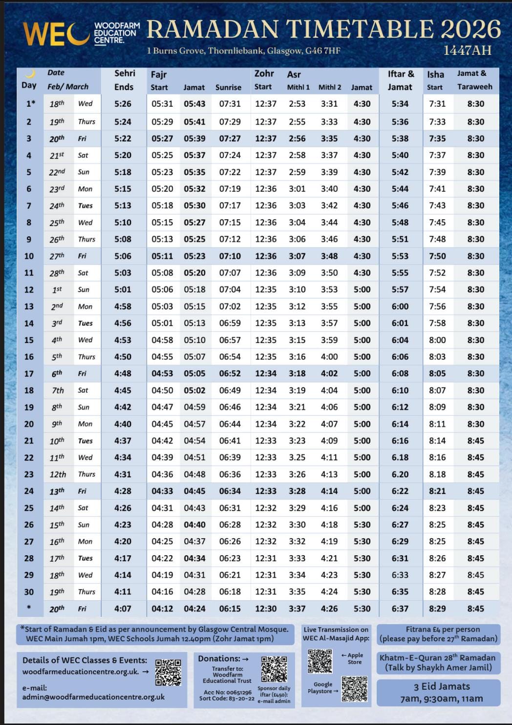 Alhamdulillah we are pleased to make available the 2026 Ramadhan timetable. View below or download a PDF copy.