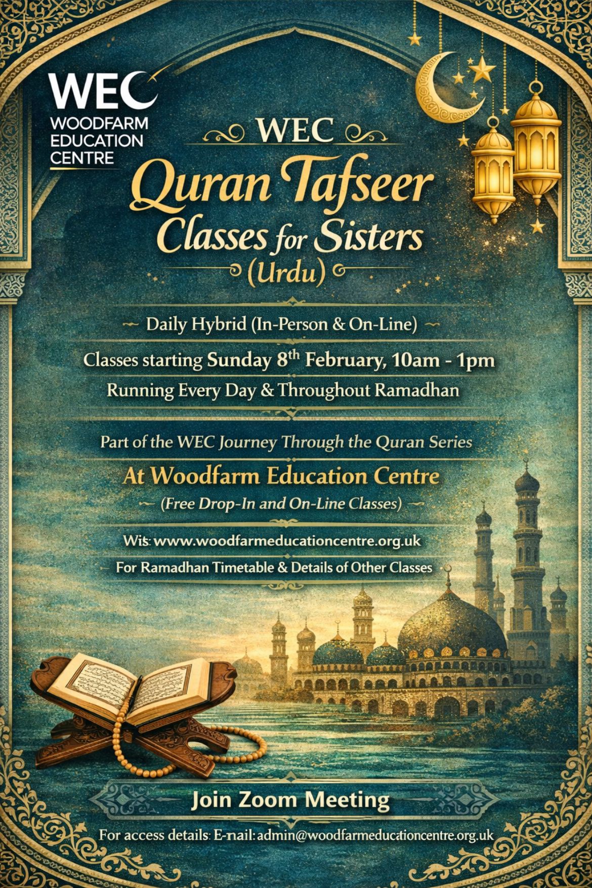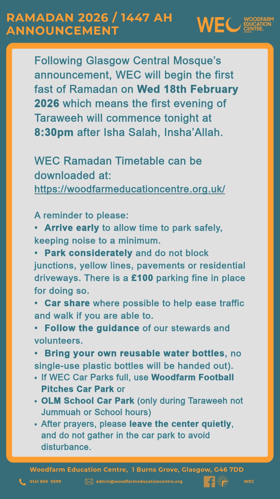 The Woodfarm Education Centre (WEC), located in Giffnock, Glasgow, is a landmark achievement and the first-ever dedicated facility acquired by East Renfrewshire’s Muslim community in over 40 years. It serves as a vibrant hub for Islamic education, spiritual development, and community engagement. The centre is run by the Woodfarm Educational Trust (W.E.T.), a registered Scottish charitable company (Scottish Charity No. SC040818).